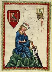 Ich heiße Walther von der Vogelweide. Zu meiner Zeit war ich ein berühmter Minnesänger. Wann ich geboren wurde, ist nicht bekannt, auch nicht der genaue Geburtsort. Man vermutet, dass es entweder Bozen oder in Böhmen war. Gestorben bin ich 1230, aber der genaue Tag ist auch davon nicht bekannt. Ich wurde oft und gerne von den Burgherren eingeladen. Man versammelte sich dann mit der ganzen Familie, den Freunden und anderen Rittern und ihren Knappen im großen Rittersaal des Palas und alle lauschten meinen Liedern. Auch bei den Festen nach einem Turnier durfte ich oft meine Kunst zum Besten geben.